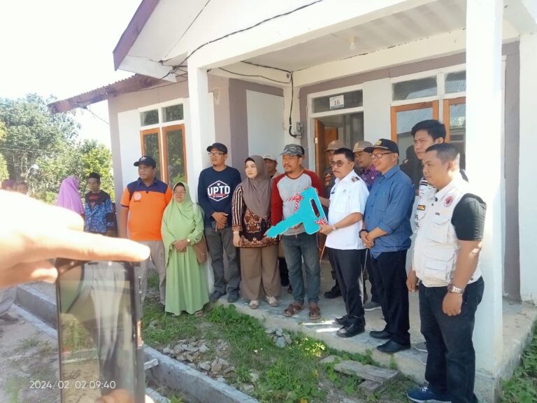 MAJENE – Bupati Majene, Andi Achmad Syukri Tammalele, menyerahkan bantuan 24 unit rumah relokasi gempa bumi terhadap warga Desa Kabiraan, Kecamatan Ulumanda, Jum’at 2/2/2024.