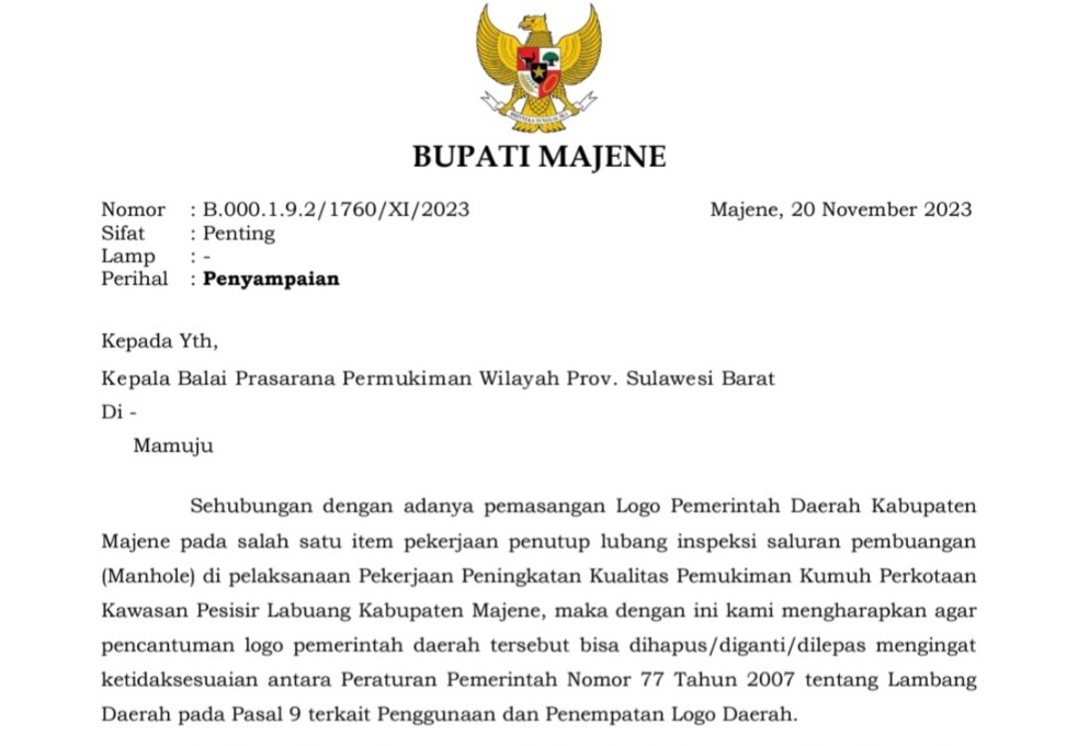 Dalam isi surat yang dilayangkan Bupati Majene kepada pihak BPPW Sulbar, untuk mendesak pihak BPPW Sulbar melepaskan logo Pemkab Majene yang telah dicantumkan kedalam Manhole dengan merujuk kepada Perda No. 7 tahun 2007 tentang lambang Daerah dan Pasal 9 mengenai penggunaan serta penempatan logo Pemkab.