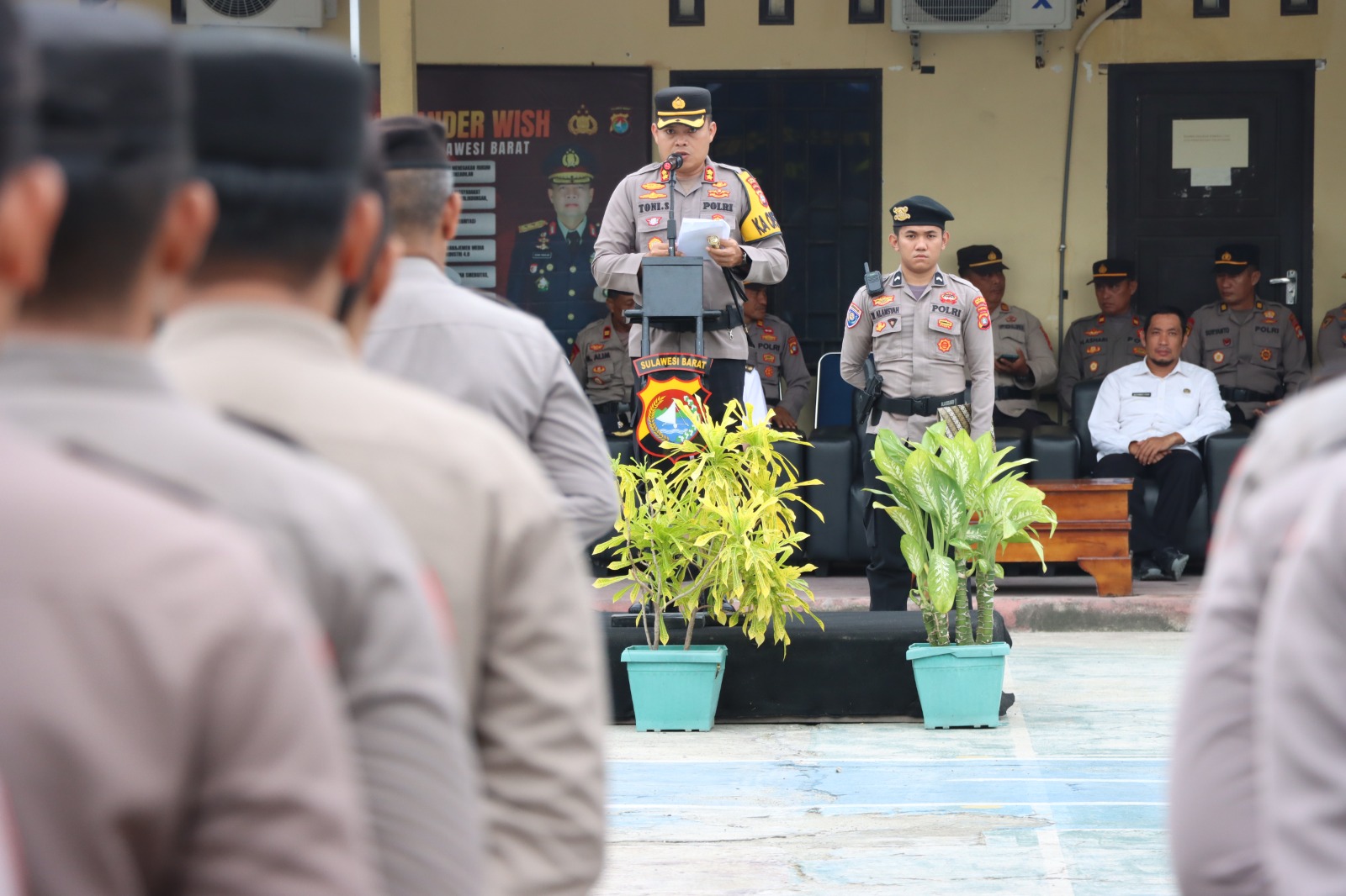 Kapolres Majene, AKBP Toni Sugadri, S.I.K selaku pimpinan apel, membacakan amanat dari Kapolri Jenderal Polisi Drs. Listyo Sigit Prabowo, M.Si, yang menyampaikan pentingnya sinergi antara TNI-Polri dengan stakeholder terkait dalam rangka pengamanan mudik dan perayaan hari raya Idul Fitri 1445 H.