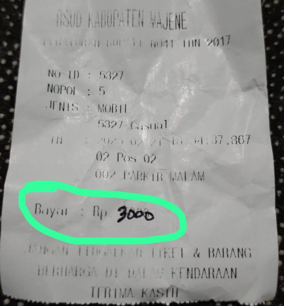 Majene,Fokustimes.com — Polemik Retribusi Parkir Rumah Sakit Umum Daerah (RSUD) Kabupaten Majene Kembali Menuai Sorotan dari Keluarga/Pembesut Pasien, Pasalnya Karcis Retribusi Dianggap Sudah tidak Original lagi Karena Nominal Asli Cetakan Telah di ubah jumlahnya dengan menggunakan Tulisan Tangan. Rabu (22/2)