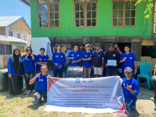 Majene,- Tim dosen dari Fakultas peternakan dan perikanan Universitas Sulawesi Barat ( Unsulbar) melaksanakan kegiatan pengabdian kepada masyarakat bertajuk peningkatan pendapatan dan kesehatan ternak melalui pengembangan sinten zero waste Farming, usaha ternak berbasis teknologi pakan dan pengelolaan limbah.